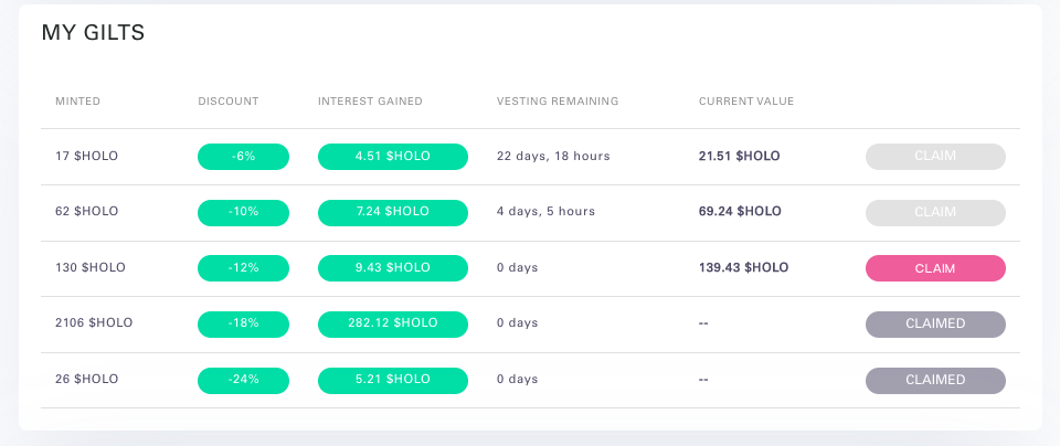 7\. Vesting remaining shows the length of time until your Gilt has 'matured' and you can claim the $HOLO