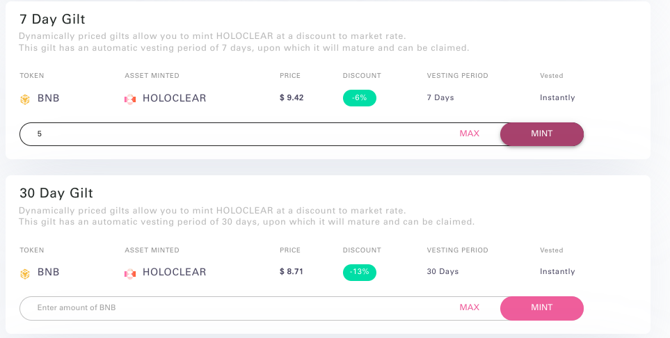 Minting Gilts is the best way to support the HOLOCLEAR long term goals as it raises funds for the treasury whilst also securing you $HOLO at a discounted rate. Gilts are automatically deposited and earning interest immediately. In order to mint please follow these steps.